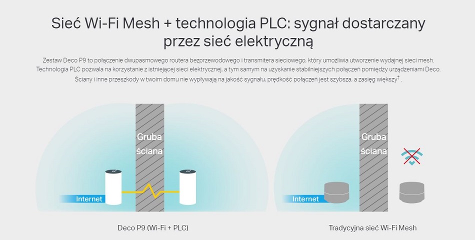 - Zastosowanie technologii PLC eliminuje problem słabego sygnału, spowodowanego obecnością ścian lub dużymi odległościami. Korzystaj z Wi-Fi w całym domu!